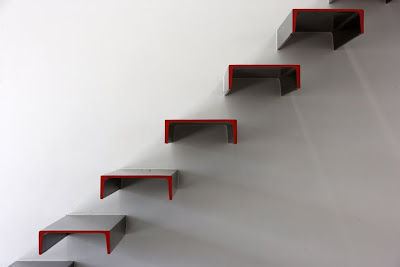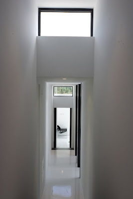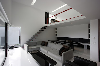 El interior de la vivienda está definido cromáticamente por la utilización de dos colores: el blanco y el negro, a excepción del detalle en rojo aplicado al canto visto de los escalones volados y a la ligera barandilla que delimita el altillo.