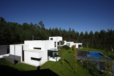 En el exterior, la piscina, en forma de L invertida, complementa la actuación, siendo el punto de unión central de las dos viviendas.