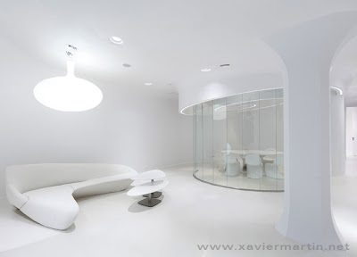 La zona de espera, con el sofá Moon de Zaha Hadid y la lámpara No Fruit de Dark, proporcionan a la sala una atmósfera futurista.