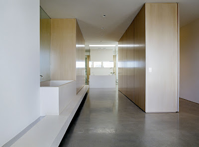 La piscina se prolonga junto a la línea acristalada definiendo la huella del edificio. El bloque de cemento se creó específicamente para que sirviera de borde de la piscina. Los reflejos y el movimiento generado por las aguas, que empiezan en la entrada y que conducen hasta el límite de atrás, crean la ilusión de amplitud.