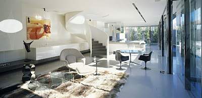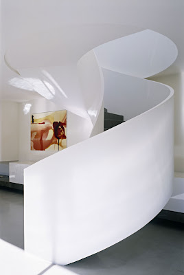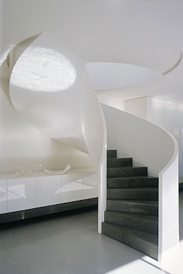 La escultural escalera, influenciada por la obra de David Chipperfield, se eleva en espiral y con elegancia a través del corazón de la residencia, estableciendo una relación vertical entre los espacios interiores horizontales. Un gran tragaluz circular sobre la escalera inunda la primera planta de luz natural.