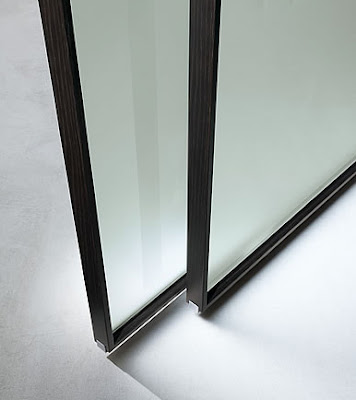 La estructura de aluminio anodizado está disponible en versión natural, negra o chapada en madera y los cristales pueden ser simples templados y dobles laminados. Tanto la versión transparente como la satinada pueden elegirse entre una amplia variedad cromática.