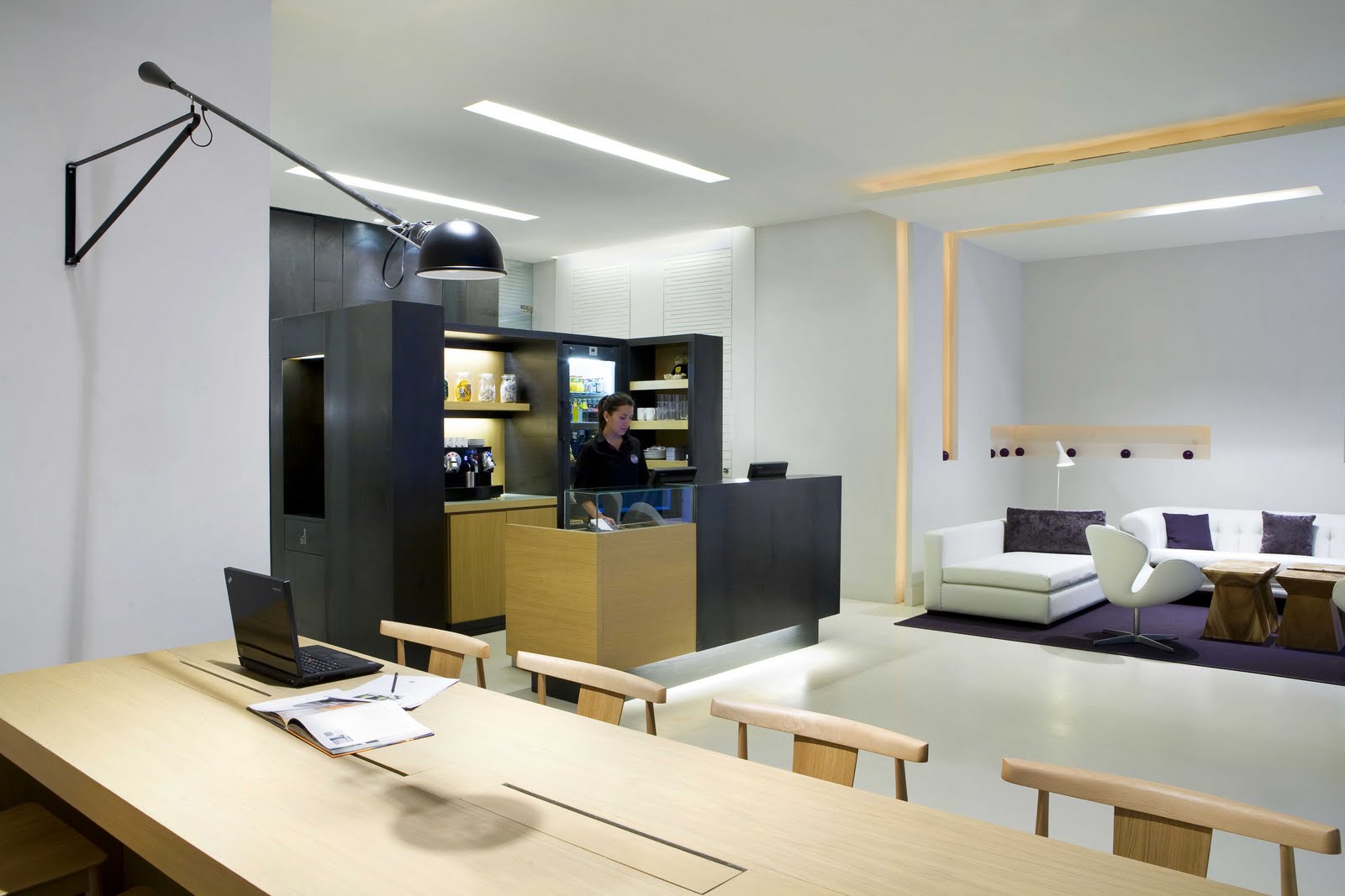 Todo el hotel respira el mismo ambiente y el mismo criterio de diseño: un estilo luminoso y minimalista, con un marcado protagonismo del color blanco y una estudiada distribución del espacio. Su estética de vanguardia se complementa con el mobiliario elegido para decorar las habitaciones y zonas comunes: lámparas de Louis Poulsen y Foscarini, sillones de Vitra y Zanotta, sofás de De Padova o butacas de Fritz Hansen, entre otras firmas de prestigio internacional.