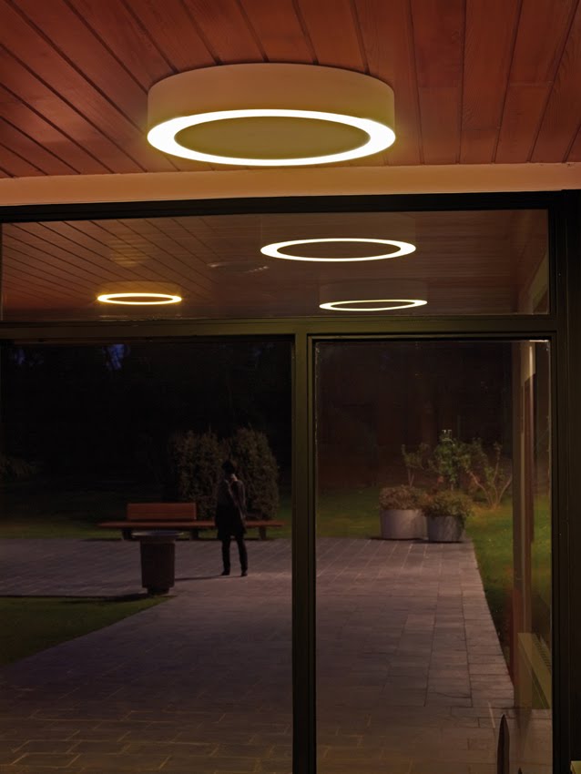 Este aplique es el resultado de la primera colaboración entre dos generaciones de excelentes diseñadores de una misma familia (padre e hijo). Disponible en tres tamaños, sus virtudes funcionales radican en su fluorescencia con alta estanqueidad y luminosidad difusa gracias a una pantalla en posición vertical, que impide que aniden los insectos en su interior.