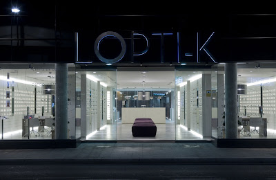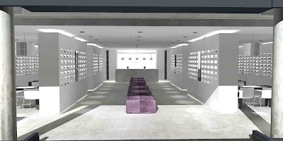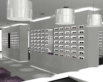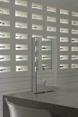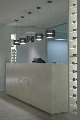 El mostrador de atención y cobro se encuentra al final del espacio expositivo, separándolo de la zona de taller. Se trata de un volumen compacto de hormigón igual que el pavimento. A ambos lados del mostrador se ubican los dos gabinetes de pruebas y, al fondo, el taller permanece completamente abierto visualmente al público.