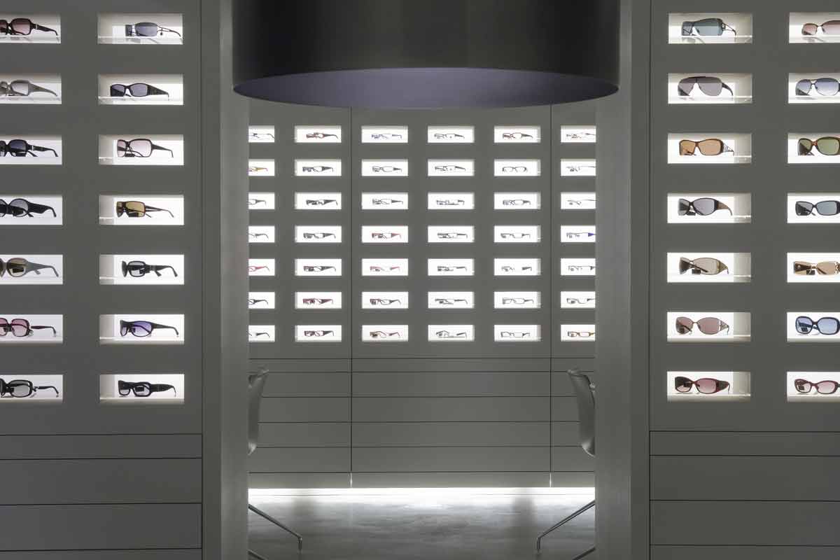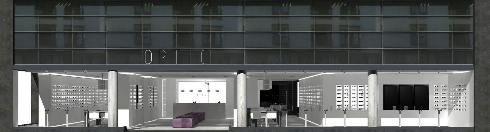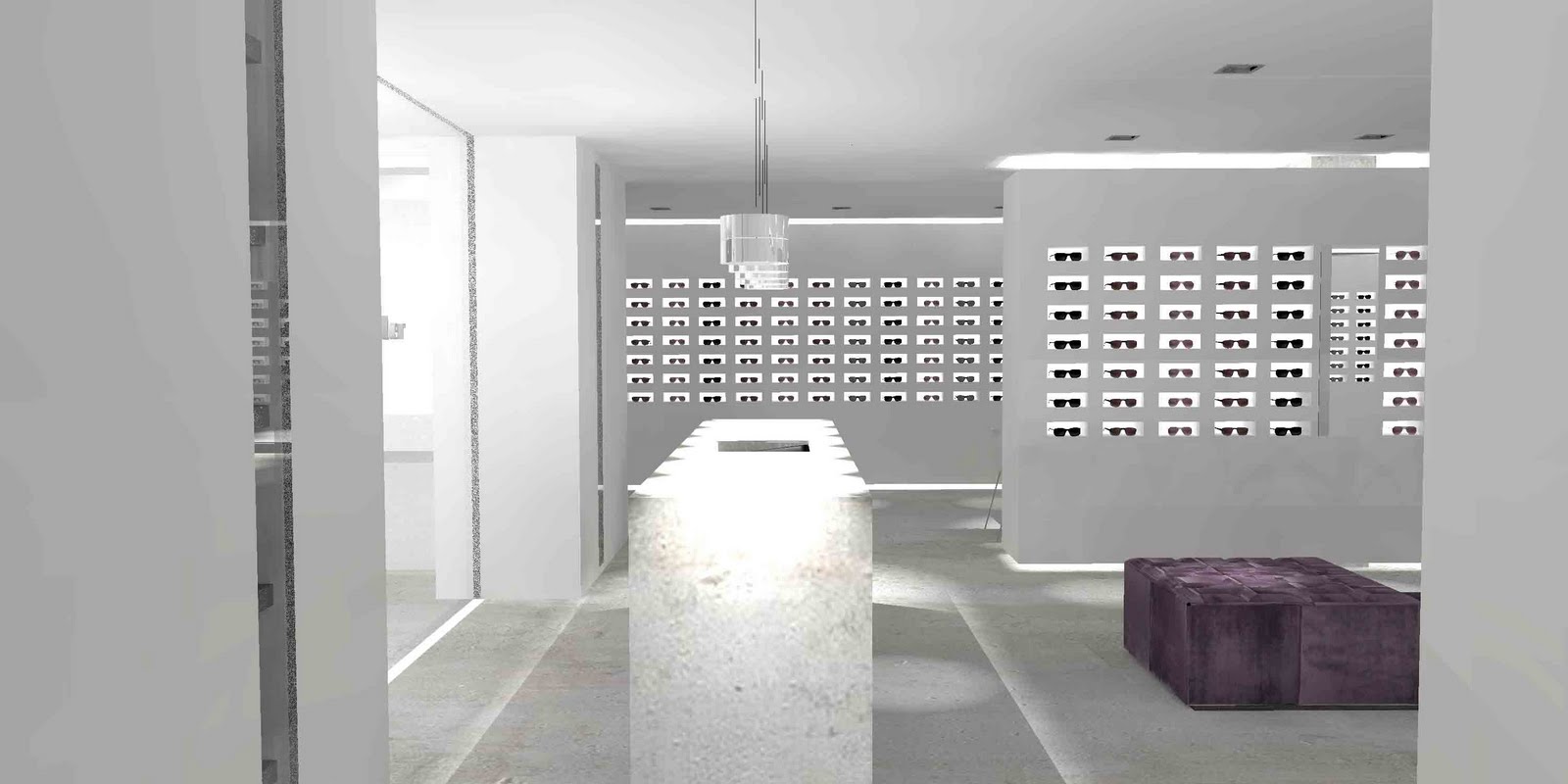 El mostrador de atención y cobro se encuentra al final del espacio expositivo, separándolo de la zona de taller. Se trata de un volumen compacto de hormigón igual que el pavimento. A ambos lados del mostrador se ubican los dos gabinetes de pruebas y, al fondo, el taller permanece completamente abierto visualmente al público.