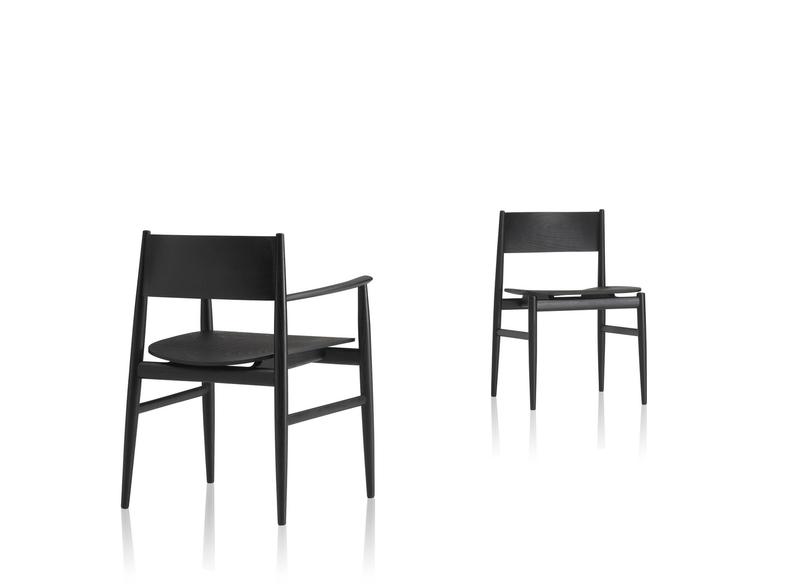 Una silla de líneas rigurosas pero suaves, que reinterpreta en clave contemporánea la clásica silla de madera. El uso de la madera de fresno tintada en negro acentúa su imagen y, al mismo tiempo, aporta elegancia. Está disponible también con brazos.