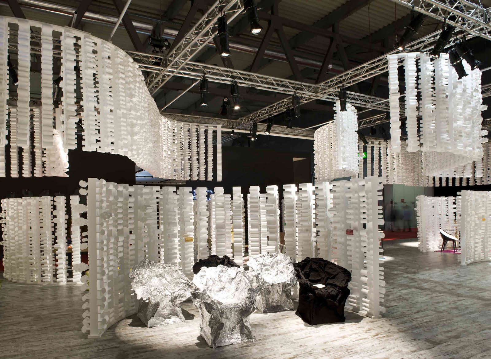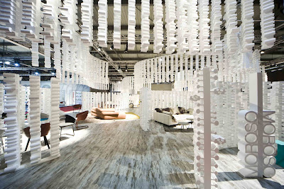 Un bosque formado por miles de columnas blancas de poliestireno. Columnas que emergen del suelo, cuelgan del techo y se disponen en líneas curvas creando microescenarios. Esta escenografía, diseñada por el Studio Urquiola, sirvió para que la firma Moroso presentara sus novedades para 2010 (algunas se muestran a continuación) en el último Salón del Mueble de Milán.