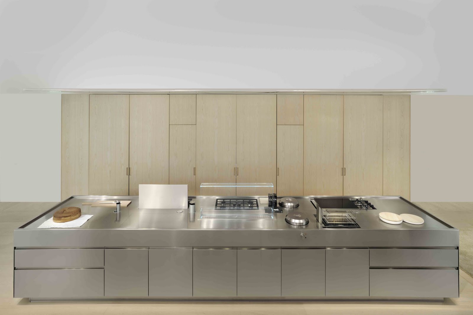 Spatia nace, a la vez, como complemento de los distintos modelos de cocina de Arclinea, aunque también dispone de elementos de mobiliario propios que acentúan su estética integradora: una isla con mesa adosada que hace las veces de encimera y comedor; módulos de armarios en suspensión a modo de mueble aparador; interiores de armario perfectamente camuflados que esconden prácticas soluciones funcionales en la cocina; e incluso, módulos de armarios que pueden ser adaptados como mueble bajo-lavabo.