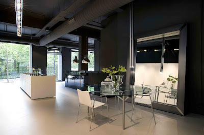 El local se caracteriza por sus altos techos de 4 m y en él destaca una zona con un lucernario que crea un efecto lumínico particular en contraste con el pavimento y las paredes oscuras. El espacio está concebido en un estilo minimalista y elegante, sutilmente industrial, reflejo de los productos de la firma italiana.