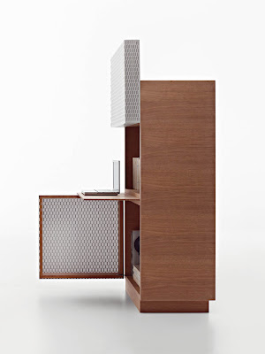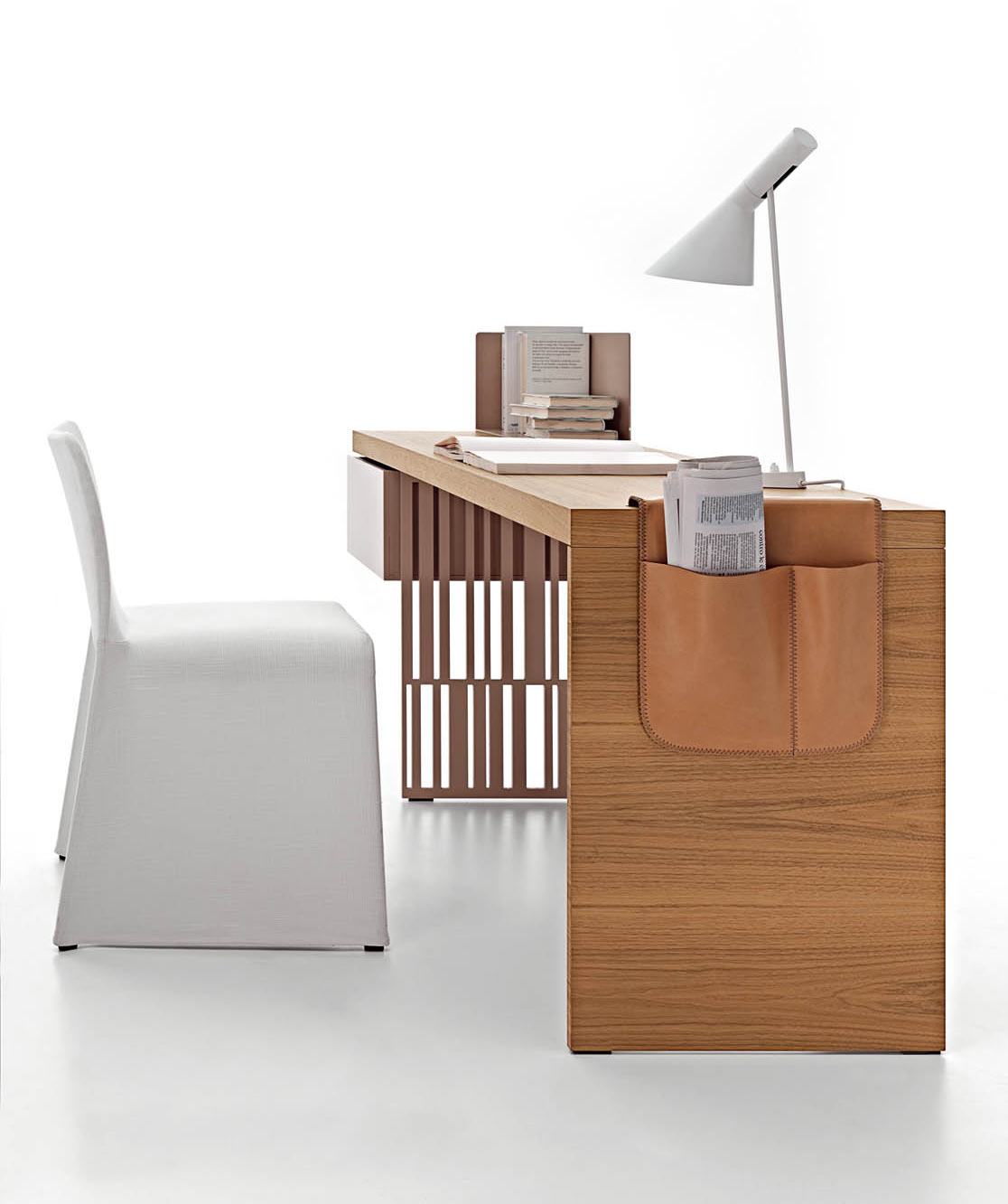 Un escritorio de madera de líneas nítidas, donde uno de los planos verticales de apoyo se ha multiperforado dejando el otro totalmente opaco. El diseño consigue que los distintos elementos que complementan el escritorio pasen casi desapercibidos: un práctico cajón lateral, un sujetalibros en metal lacado y un bolsillo lateral de cuero.