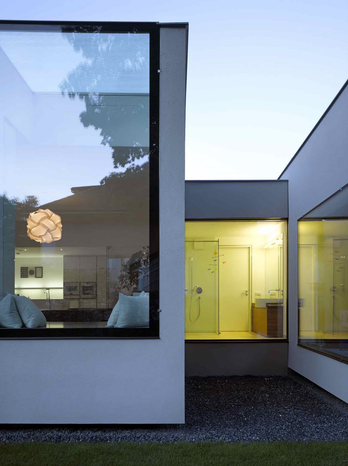 Por otra parte, la Casa Elise disfruta de una condiciones de luz excepcionales. Todas las ventanas y acristalamientos verticales tienen diferentes formas y sus marcos oscuros rompen con la monocromía de los paramentos verticales. Además al hacerlos coincidir con las aristas de las esquinas se produce un interesante efecto óptico.