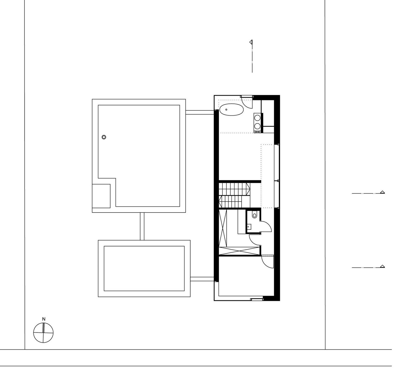Para la habitación infantil, se ha reservado el volumen cercano a la calle que se abre a un pequeño patio. El dormitorio principal y la habitación de invitados se han ubicado en un nivel superior sobre el jardín. Incluso el baño disfruta de las vistas de esta zona exterior, sorprendiendo por ello.