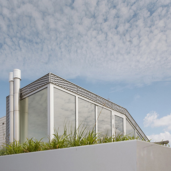 La casa está coronada por un jardín en la azotea. Una vez más, la curva del techo superior tiene una función específica: el jardín se convierte en un paisaje inclinado que eclipsa la calle y los edificios circundantes.