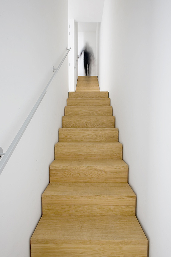La estructura básica del edificio se divide en dos. Una franja más estrecha y compacta destinada a la zona de servicios: baños, cocina, escalera y las instalaciones técnicas, y un espacio adyacente totalmente abierto para las habitaciones.