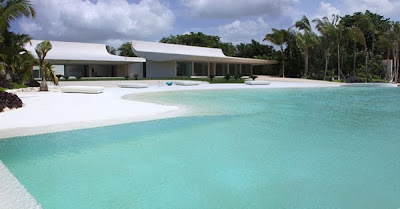 A pesar de que la parcela dispone de playa propia y embarcadero, se ha diseñado una gran piscina, al borde del mar a modo de playa, en la que predominan las formas curvas y que parece prolongarse en el mar Caribe.