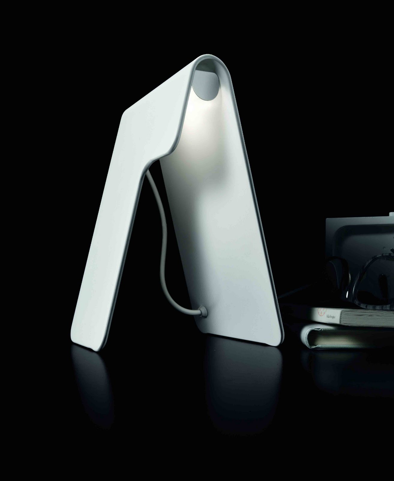 Una lámpara de mesa amable y sencilla, inspirada en la palma de una mano que contiene una luz: un gesto que se traduce en una única lámina metálica blanca con un perfil mínimo que es, al mismo tiempo, pantalla y apoyo.