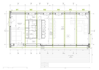 La casa consta de 6 módulos prefabricados en su planta principal: el primero alberga el dormitorio, en el segundo se encuentran el baño y la escalera, en el tercero la cocina, y los tres últimos forman el espacio principal de salón-comedor.
