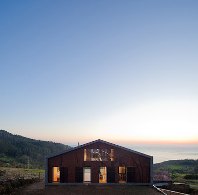 A pesar de ser una casa modular prefabricada, Casa Cedeira no tiene aspecto de barracón “de diseño”, ni de container reciclado, sino que simplemente parece una casa: dispone de su tejado a dos aguas (obligatorio por la normativa de la zona), sus ventanas batientes y su interior diáfano más propio de un loft urbano que de una casa de campo.