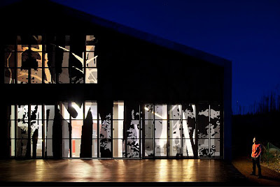 El volumen resultante se ha envuelto de dos materiales que establecen un lenguaje con el paisaje del entorno: Viroc®, un prefabricado de cemento y virutas de madera de color grisáceo eucalipto en cubierta y fachadas laterales; y en las dos fachadas principales acero corten perforado según una silueta que recrea el bosque circundante.