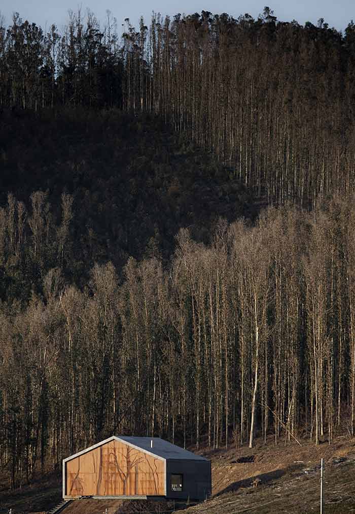 El volumen resultante se ha envuelto de dos materiales que establecen un lenguaje con el paisaje del entorno: Viroc®, un prefabricado de cemento y virutas de madera de color grisáceo eucalipto en cubierta y fachadas laterales; y en las dos fachadas principales acero corten perforado según una silueta que recrea el bosque circundante.