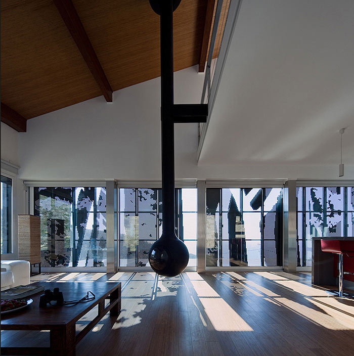 Todos los espacios se han distribuido siguiendo el esquema de planta abierta, dando máximo protagonismo al paisaje. En la planta superior se sitúa una buhardilla también diáfana de doble fachada abierta: hacia el mar en el suroeste y hacia los bosques en el noreste. Este espacio polivalente no tiene de momento un uso determinado; puede servir como dormitorio de invitados, sala de tai-chi o zona de juegos infantiles.