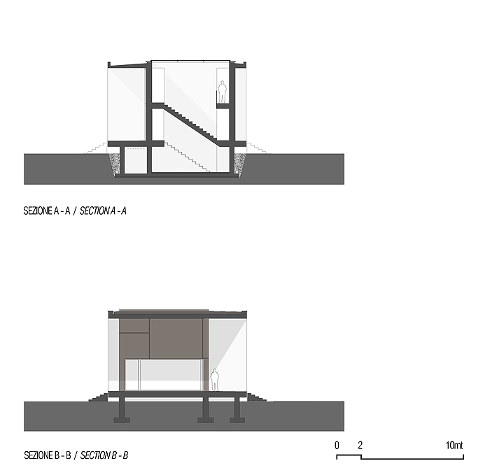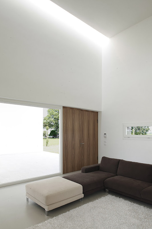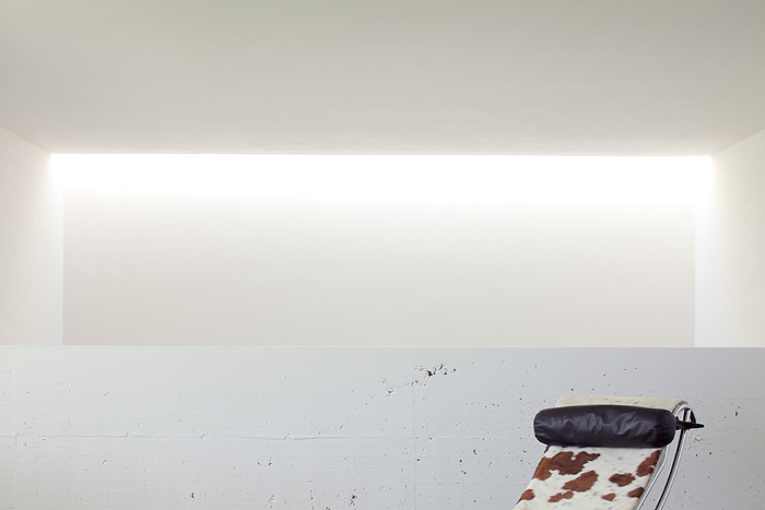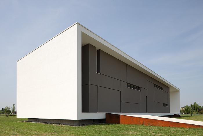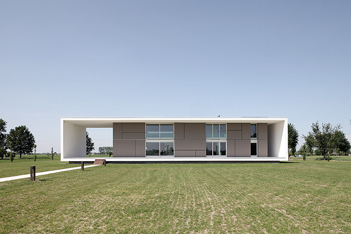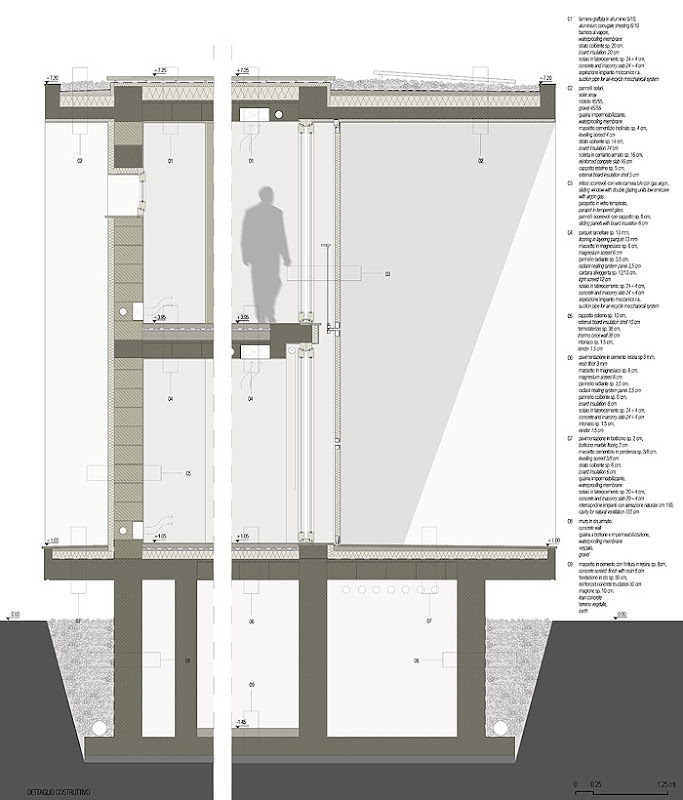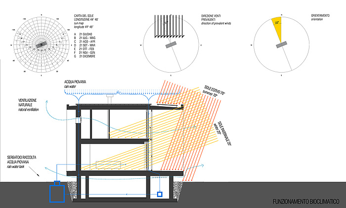 Por ejemplo, el estudio de la inclinación del sol en las diferentes épocas del año ha servido para calcular su incidencia sobre el volumen externo y dimensionar correctamente los amplios paramentos de vidrio y los paneles correderos. Estos ventanales, que enmarcan el hermoso paisaje que rodea la casa, se han realizado en madera contrachapada y vidrios laminados de baja emisividad con gas noble (argón).