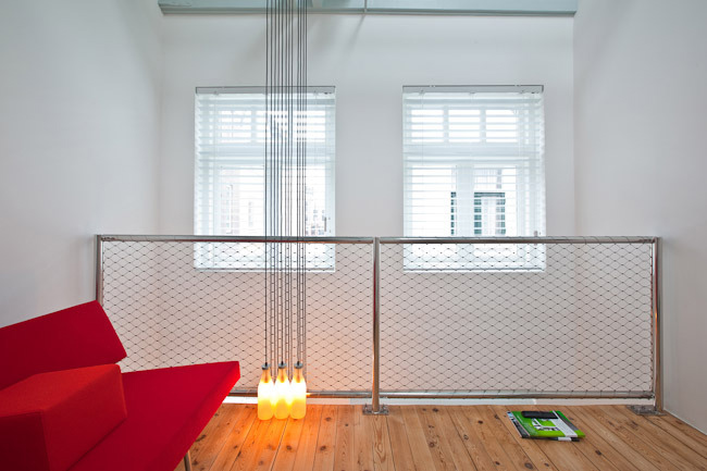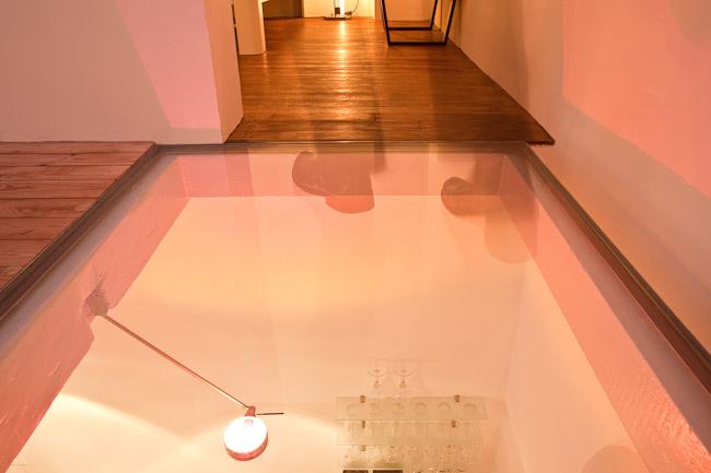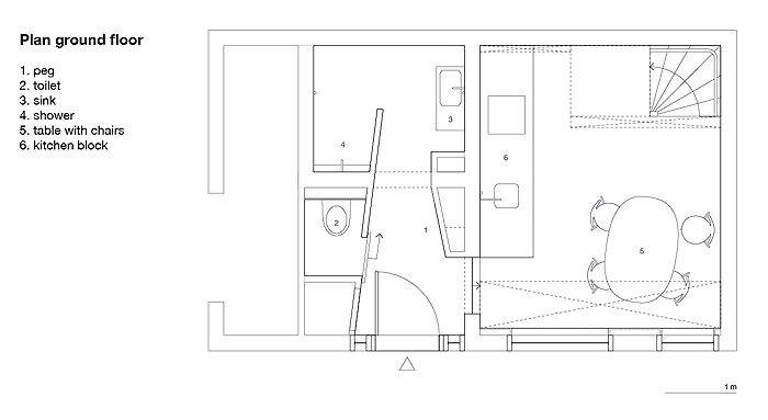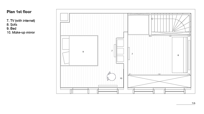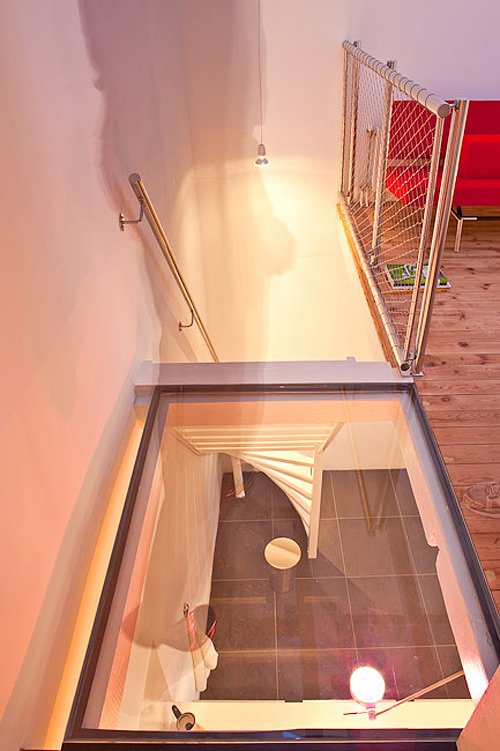 El espacio tiene su propia entrada y se divide en dos niveles. En la planta baja: hall, comedor, cocina y baño con ducha. En el primer piso: un salón, que juega con un suelo en madera y cristal transparente, y un dormitorio. En el techo se han dejado las vigas de madera vistas, a las que se les ha aplicado un suave color. La conexión abierta entre la cocina y el salón crea la sensación de espacio continuo.