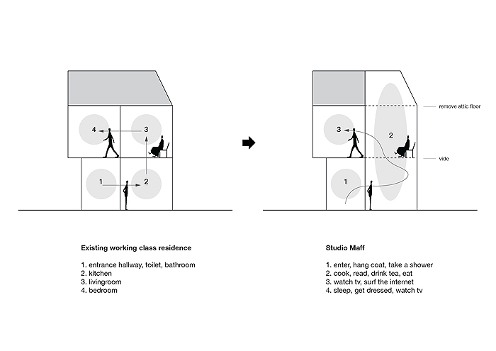 Maff Studio es el sucesor de Maff Apartment, otra rehabilitación que llevaron a cabo para el mismo cliente en 2007. Pero mientras Maff Apartment está situado en el ático de un edificio con vistas a la ciudad, Maff Studio es una vivienda independiente a nivel de calle.