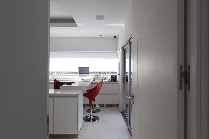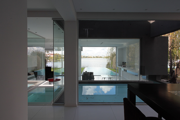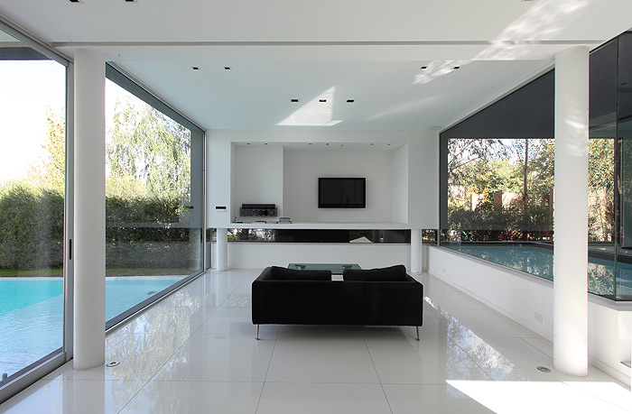El fuelle de agua que los separa, permite bañar los ambientes de luz indirecta a través del reflejo que genera el sol del norte sobre él, evitando el recalentamiento de los mismos. De esta manera, la luz está presente en todos los ambientes de la casa pero nunca de forma directa.