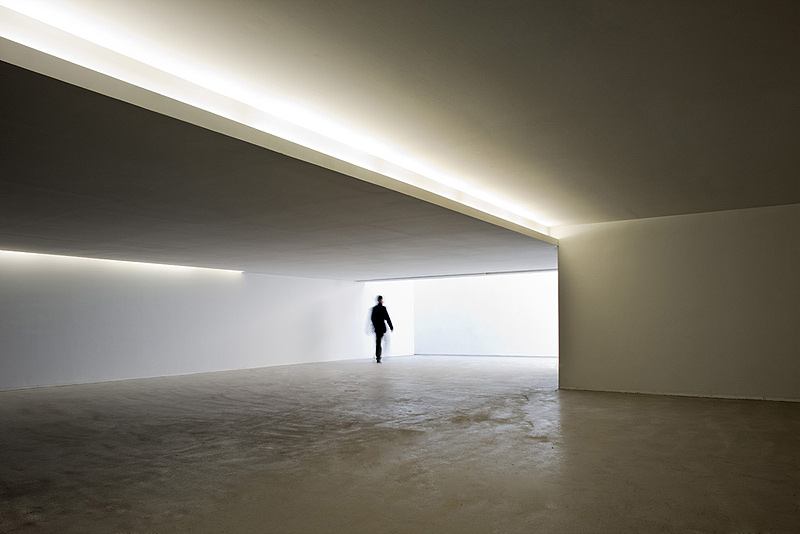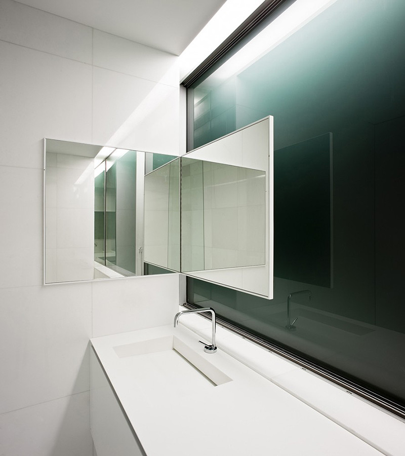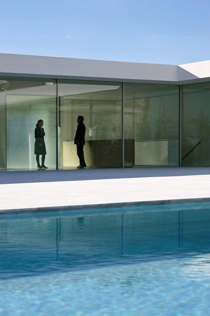 La zona Sur, en la que se disponen las estancias de día, desmaterializa su presencia gracias a la luz cenital. En la zona Oeste, las habitaciones recaen a una porción de parcela con una escala más doméstica, mientras la habitación principal se asoma a la luz de levante reflejada sobre el agua.
