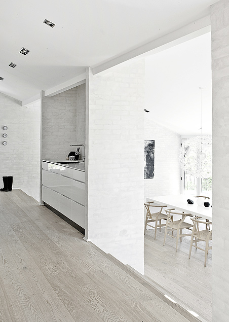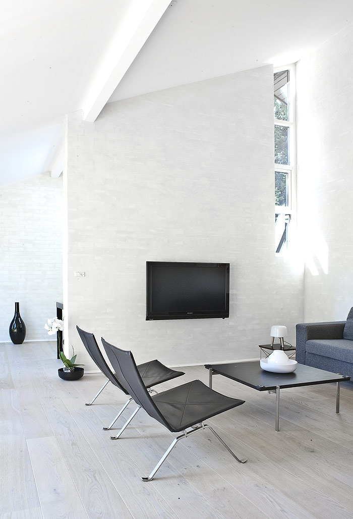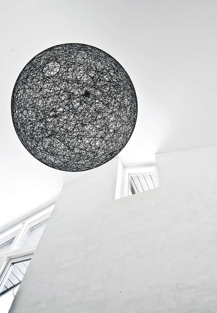 A primera vista, la construcción no revela su gran tamaño hasta que no se camina a lo largo de la fachada Este, a través de un pequeño camino, que guía la subida hacia la entrada principal. Traspasada esta entrada, la estética de la casa da un giro inesperado y se pasa de un exterior de estilo rural a un interior minimalista, blanco, sereno y equilibrado dentro de una distribución intencionadamente pseudo laberíntica.