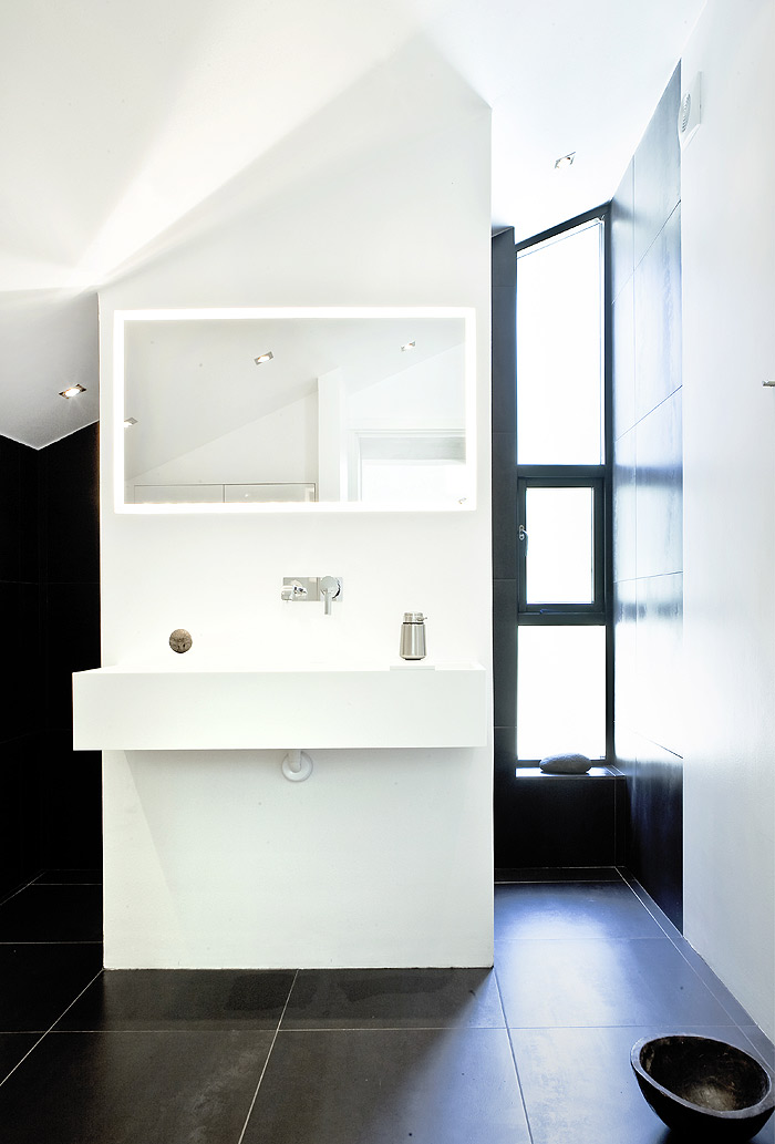 El baño principal también está situado en conexión con la escalera central. Se accede a él a través de un pequeño y estrecho pasillo con una zona de almacenamiento integrada. Para conseguir un espacio íntimo, se ha revestido y pavimentado en parte con cerámica de color negro.