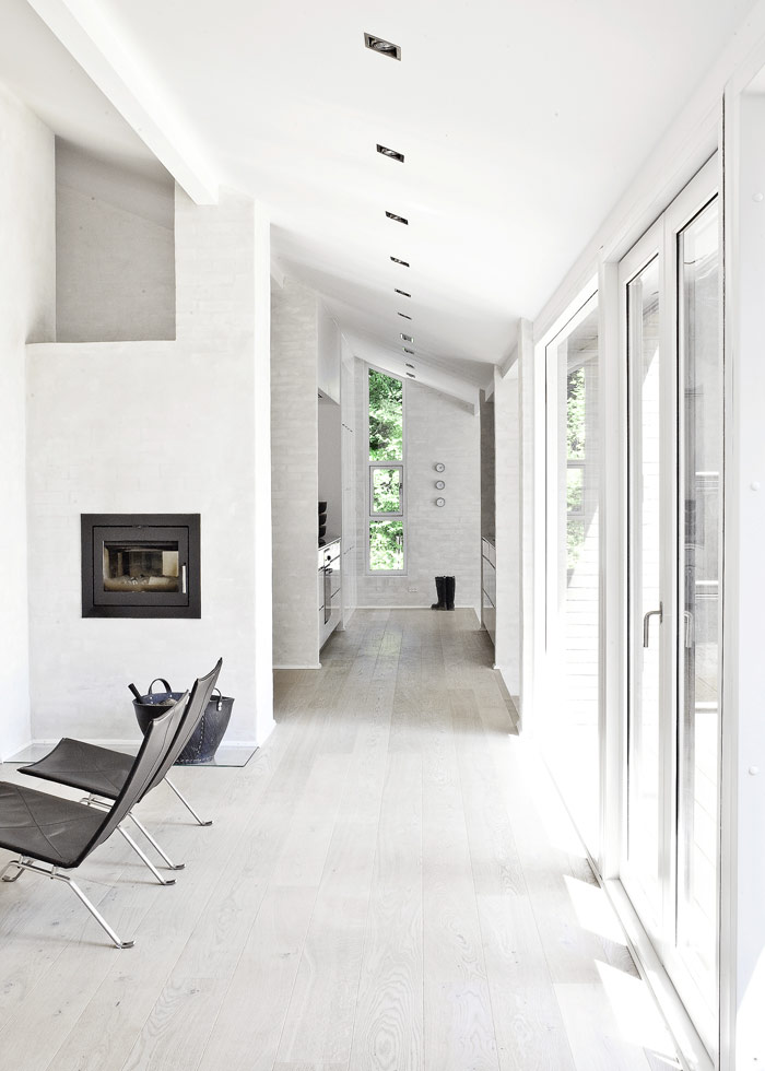 Uno de los principales objetivos a la hora de diseñar la Casa Fredensborg ha sido conseguir una sensación de calma y serenidad. Esto se ha logrado reduciendo al mínimo el uso de materiales de contraste. También para adaptarse a la estética de los edificios circundantes, se ha recurrido a la utilización de materiales propios de la zona. Así que, mientras para el exterior, se ha usado baldosas y ladrillos en tono amarillo, y madera pintada de negro, en el interior pueden verse delgadas paredes sin un acabado fino, suelos de roble natural cepillado y techos blancos.