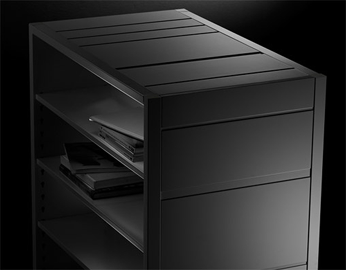 Una estantería componible y personal, fácilmente adaptable gracias a sus diferentes medidas. Está realizada con los costados en chapa blanca de una sola pieza y revestimiento lateral en madera, DM o lacado. El techo también puede personalizarse en esos materiales. El entrepaño es metálico y la fijación de estantes no precisa de tornillos por lo que su montaje es rápido y fácil.