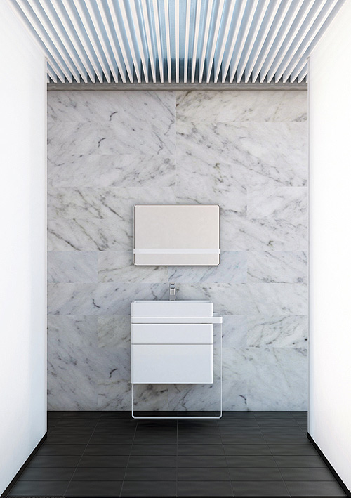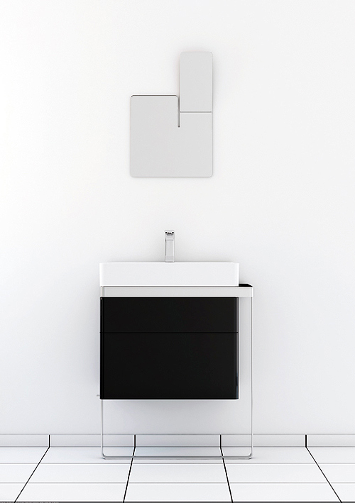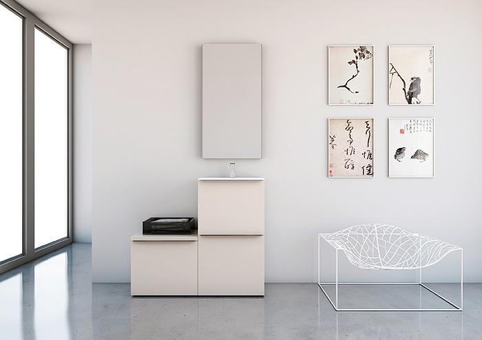 La estructura se presenta en cromo brillo o lacado blanco brillo, el mobiliario –en acabado lacado- puede adquirirse en una amplia gama de colores y los lavamanos están fabricados en Mineral Marmol.
