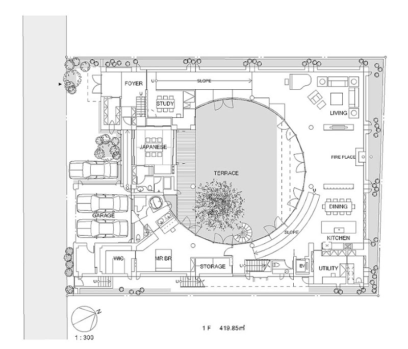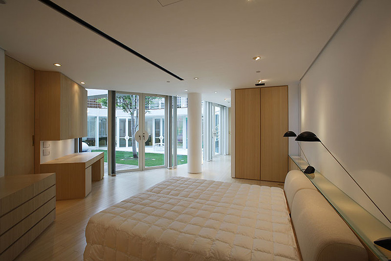 Cerca de la entrada, y en una zona de altillo, se ha dispuesto una habitación japonesa para acomodar a los posibles invitados. Al lado, y de fácil acceso desde la entrada, se encuentra el estudio del propietario. Desde aquí, un pasillo curvo va pasando por las diferentes estancias de esta primera planta: el salón, la sala con la chimenea, el comedor y la cocina. Desde esta última zona, una rampa conecta este espacio abierto con el dormitorio principal, que dispone de baño privado. Desde aquí, una escalera conduce a una sala de proyección adyacente a las habitaciones infantiles y al baño familiar de la segunda planta. Al sur de estas habitaciones, se extiende una espaciosa terraza ajardinada con vistas al patio central.