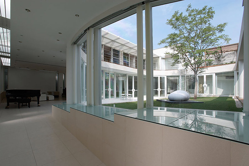 A la hora de diseñar la vivienda, las paredes exteriores de la casa “fueron empujadas” hacia los límites del solar, mientras que la zona interior se reservó para construir un patio central redondo de 15 m de diámetro, delimitado por paredes acristaladas. Esta salida al exterior desde el interior, que se materializa a través del citado patio, se convierte en un punto neurálgico y de encuentro de las diferentes estancias, ya que todas las habitaciones están orientadas hacia él. También la terraza ajardinada del nivel superior mira a este punto central.