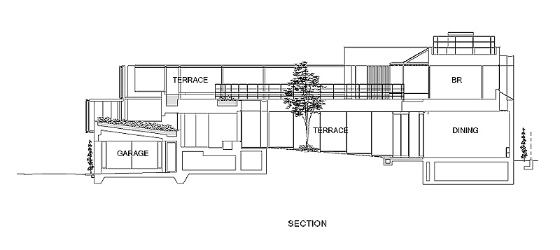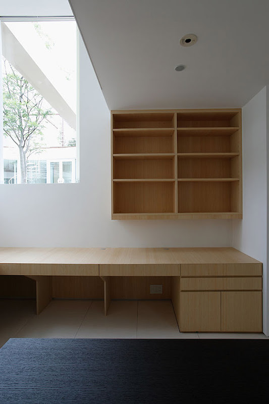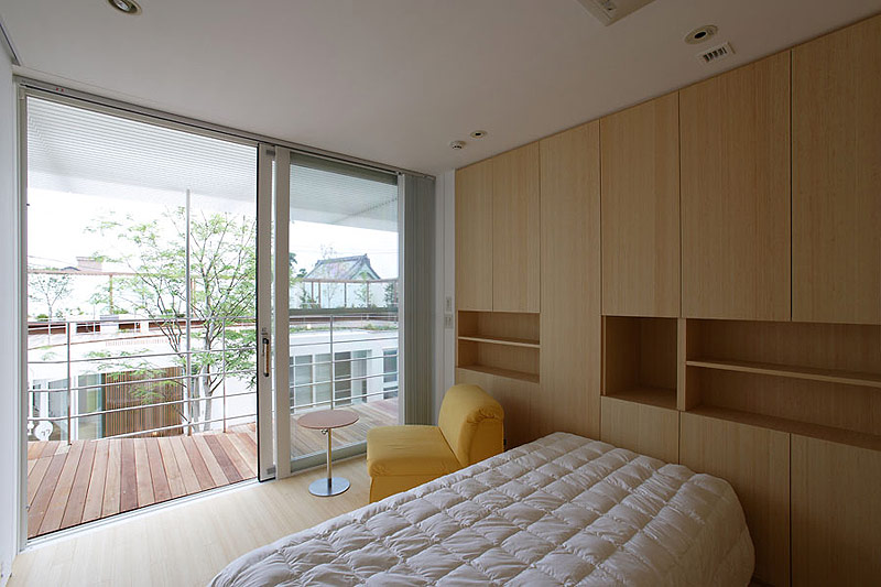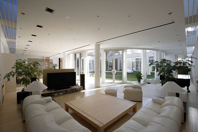 Cerca de la entrada, y en una zona de altillo, se ha dispuesto una habitación japonesa para acomodar a los posibles invitados. Al lado, y de fácil acceso desde la entrada, se encuentra el estudio del propietario. Desde aquí, un pasillo curvo va pasando por las diferentes estancias de esta primera planta: el salón, la sala con la chimenea, el comedor y la cocina. Desde esta última zona, una rampa conecta este espacio abierto con el dormitorio principal, que dispone de baño privado. Desde aquí, una escalera conduce a una sala de proyección adyacente a las habitaciones infantiles y al baño familiar de la segunda planta. Al sur de estas habitaciones, se extiende una espaciosa terraza ajardinada con vistas al patio central.