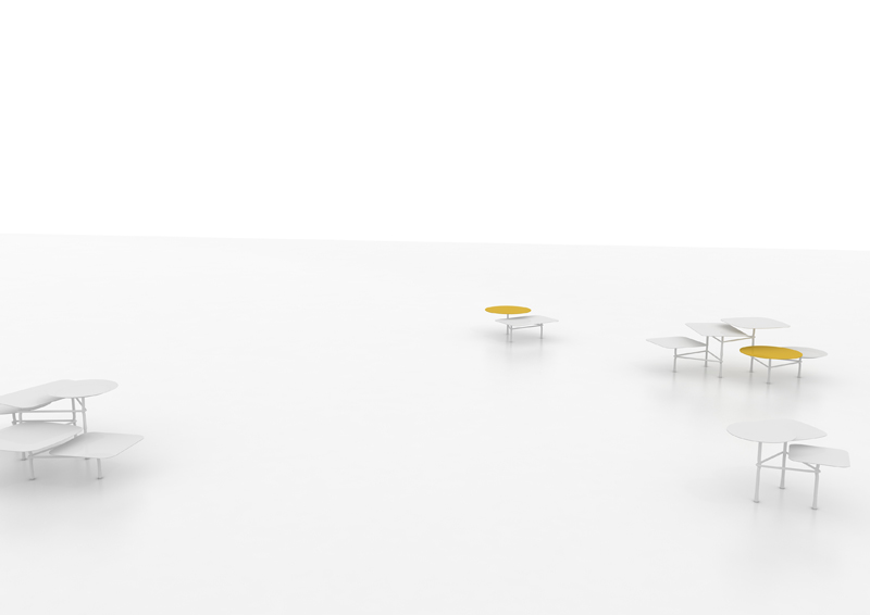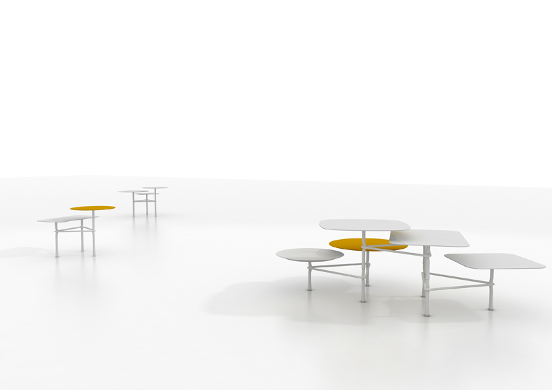Para ello dispone de dos tipos de bases diferentes de distinto tamaño, cuatro sobres que varían en forma y medidas, y una bandeja circular. La característica base de tres patas abrazadas por una varilla recuerda a la colección de taburetes Last Minute, diseñada también por Urquiola, para esta misma firma, y que se ha convertido en una de las señas de identidad de Viccarbe.