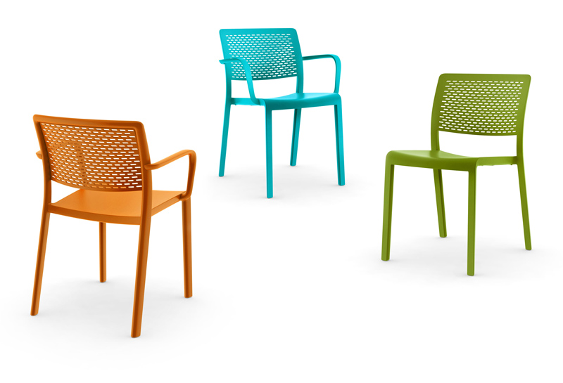 Una silla ligera visual y realmente gracias al diseño de su respaldo perforado que, al mismo tiempo, contribuye a que aumente su confortabilidad al hacerlo transpirable. Estéticamente, en su uso en exteriores, se consigue un interesante efecto de sombras.