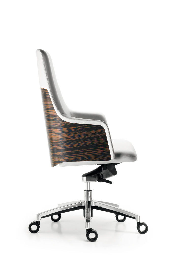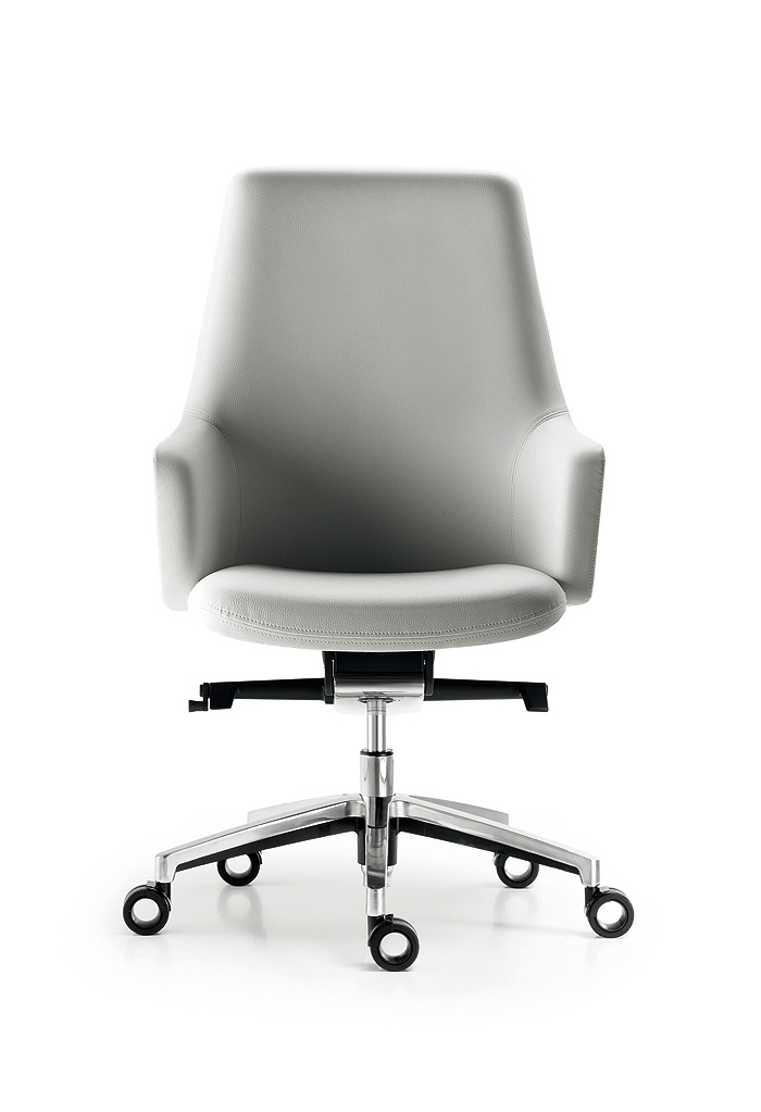 La operatividad del sillón se complementa con mecanismos de regulación tipo syncro para asiento y respaldo, y de elevación amortiguada del asiento, así como con una base en aluminio inyectado de cinco apoyos y ruedas de rodadura blanda.