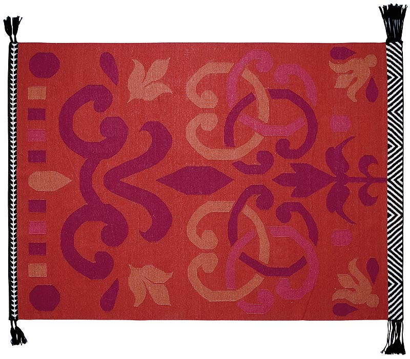 Una alfombra básica, clásica y contemporánea, práctica y reversible, confeccionada a mano en 100 % lana virgen. Colores: rojo y verde. Medidas: 150 x 200 cm, 170 x 240 cm y 200 x 300 cm.