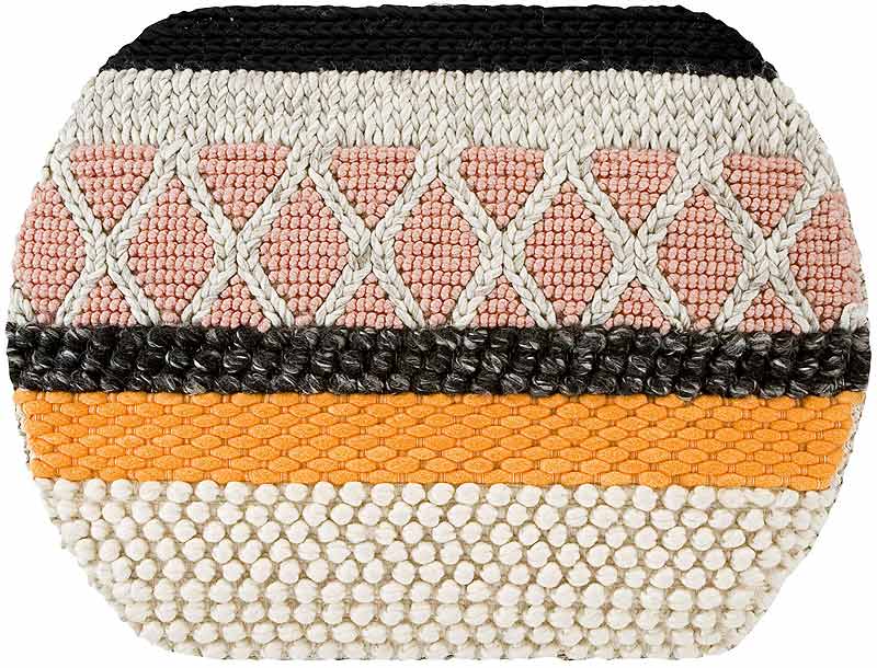 Dos divertidas colecciones de alfombras con cierto aire infantil, fabricadas con lana virgen y reverso de algodón. El transportador 360º se presenta con dos diseños y dos diámetros diferentes: 120 y 225 cm. El transportador 180º tiene unas medidas totales de 120 x 70 cm y 225 x 125 cm. Los colores disponibles son el negro y el blanco.
