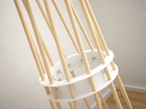 El perchero Ker, que rompe con la línea más técnica y fría de los productos de Advanced, está fabricado con barras de madera de haya, fijadas con palomillas a un aro de acero epoxi pigmentado en blanco o negro. El suave giro inclinado que se le imprime a las varillas consigue que la pieza cobre movimiento sin moverse.