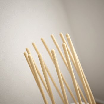 El perchero Ker, que rompe con la línea más técnica y fría de los productos de Advanced, está fabricado con barras de madera de haya, fijadas con palomillas a un aro de acero epoxi pigmentado en blanco o negro. El suave giro inclinado que se le imprime a las varillas consigue que la pieza cobre movimiento sin moverse.
