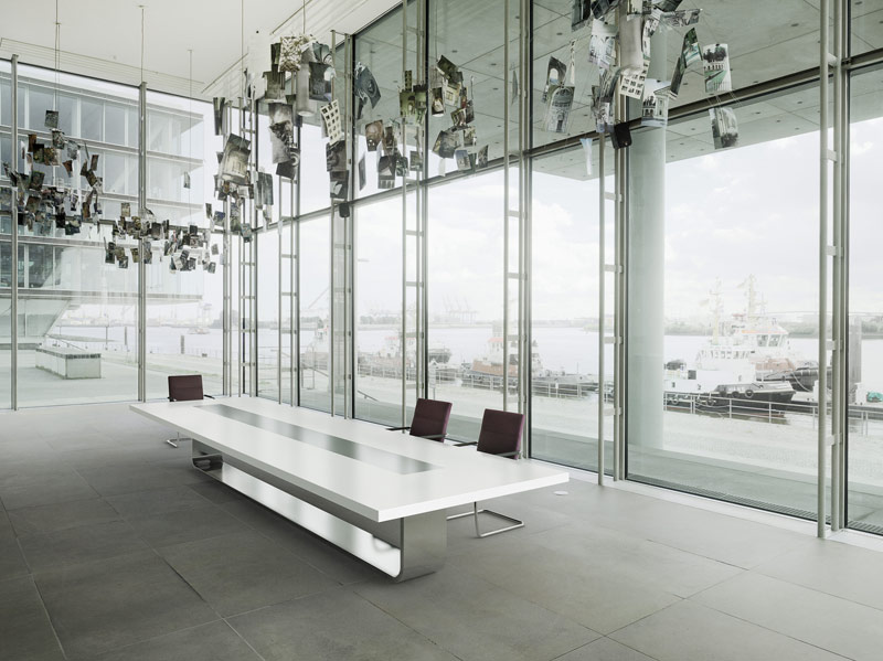 El renombrado arquitecto y diseñador iraní es el autor de este moderno sistema de mesas de conferencia, una pieza que parece flotar en el espacio gracia a que el tablero reposa únicamente sobre un estribo central de acero inoxidable. Este arco, que funciona como base, es el mismo que continúa a lo largo de la superficie del sobre y constituye el elemento central donde se ocultan los dispositivos de la mesa (conexión multimedia, proyector, nevera para bebidas o cajas de almacenamiento…).