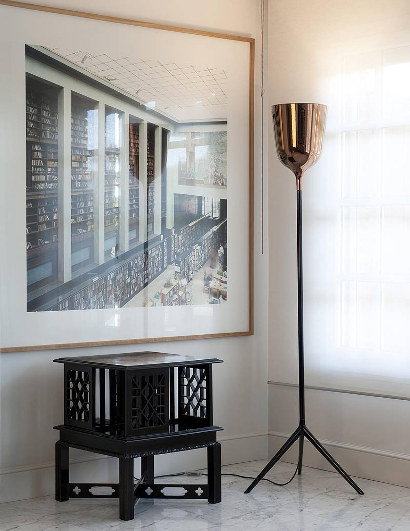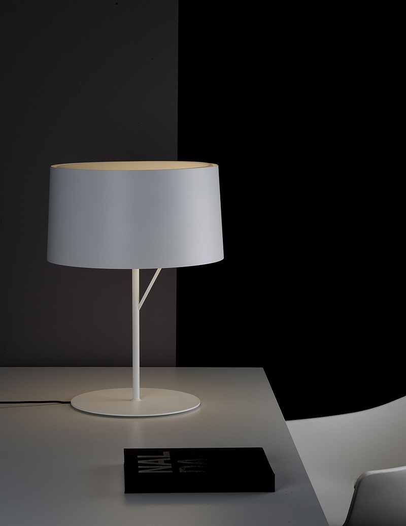 La versión de pie tiene la estructura de acero y la base en forma de trípode en aluminio, en laca blanca o negra. La pantalla puede ser de porcelana blanca combinada con la estructura también blanca y la pantalla negra o cobre combinada con la estructura en negro. El encendido táctil tiene la función on/off y el dimmer en la columna.