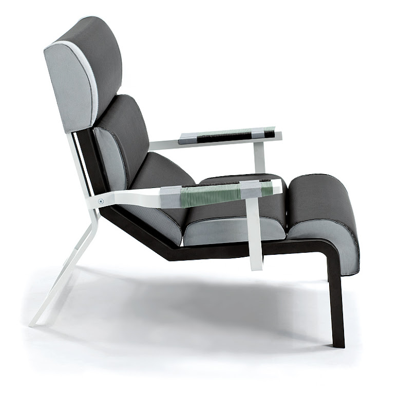 El programa, que consta de sillón relax, reposapiés y mesa auxiliar, tiene un chasis de aluminio de color oscuro que le confiere robustez por la parte frontal, mientras que la parte trasera destaca por una elegante construcción ligera. El asiento está formado por suaves y voluminosas varillas, acentuadas por puntadas visibles. Para el detalle de los reposabrazos y los asideros del reposapiés, así como de la mesa lateral, se ha utilizado cordón.