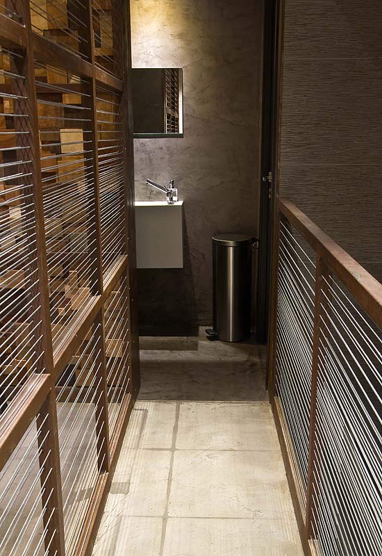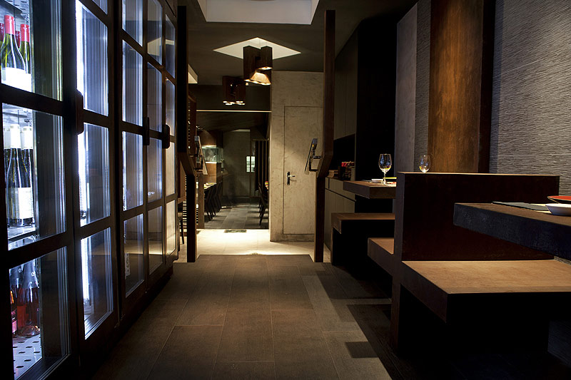 En la sala, se distingue el techo central de costillas de madera maciza teñidas de oscuro. El techo se ha bajado en las zonas de las bancadas laterales para dar más intimidad y otorgar mayor apertura a la zona central. En la parte posterior, el show cooking se levanta como un monolito de acero corten, únicamente roto por la ventana horizontal en esquina, que preside el espacio.